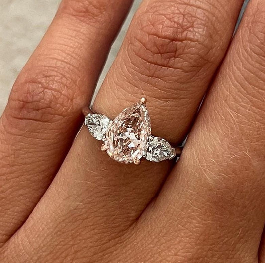 2.70 Carat Pear Cut Fancy Intense Pink Lab Grown Diamond Three Stone Ring