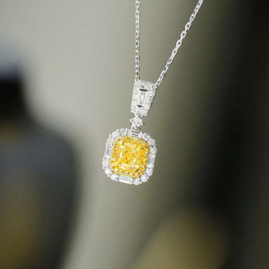 14k white gold Cushion cut Intense yellow Lab Grown diamond Quality Hallo pendant necklace