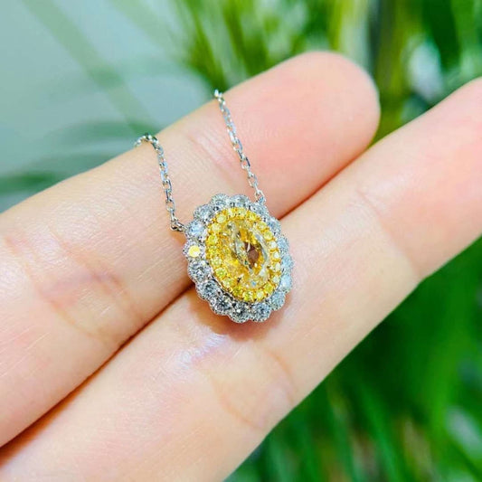 14kt white gold Oval Cut Intense yellow Lab Grown diamond Halo Quality pendant Necklace
